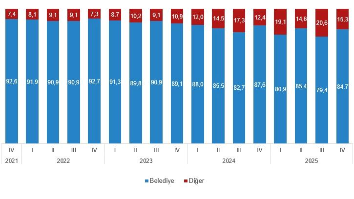 Yapı kullanma müsaade evrakı verilen yüzölçümde belediye ve öbür yetkili yönetimlerin hisseleri (%), IV. Çeyrek 2025
