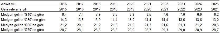 Toplumun genel seviyesine nazaran muhakkak bir hududun altında gelire sahip olan bireyler nispî manada fakir sayılmaktadır. Muadil hanehalkı kullanılabilir fert medyan gelirinin %50’si dikkate alınarak belirlenen yoksulluk sonuna nazaran, yoksulluk oranı 2025 yılında 0,6 puan azalarak %13,0 oldu. Medyan gelirin %60’ı dikkate alınarak belirlenen yoksulluk sonuna nazaran hesaplanan yoksulluk oranı ise son yılda tekrar 0,6 puan azalarak %20,6 olarak gerçekleşti.