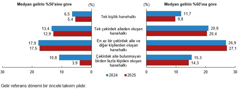 Hanehalkı tipine nazaran muadil hanehalkı kullanılabilir fert medyan gelirinin %50’si dikkate alınarak hesaplanan yoksulluk oranlarına bakıldığında; çekirdek aile bulunmayan birden fazla bireyden oluşan hanehalklarında yoksulluk oranı bir evvelki yıla nazaran 6,9 puan azalarak %3,9, tek kişilik hanehalklarında ise 1,1 puan azalarak %5,4 olmuştur. En az bir çekirdek aile ve öteki şahıslardan oluşan hanehalklarının yoksulluk oranı 0,4 puan azalarak %17,5, tek çekirdek aileden oluşan hanehalklarının yoksulluk oranı ise 0,5 puan azalarak %12,9 oldu.