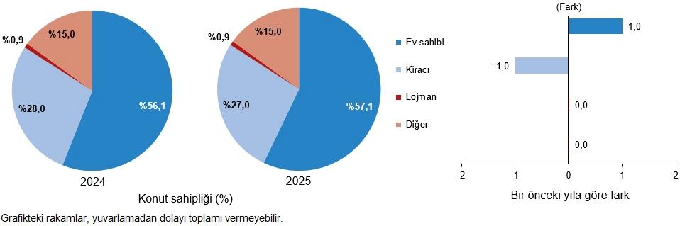 Oturulan konuta sahip olanların oranı geçen yıla nazaran 1,0 puan artarak 2025 yılında %57,1 olarak hesaplanırken, kirada oturanların oranı %27,0, lojmanda oturanların oranı %0,9, kendi konutunda oturmayıp kira ödemeyenlerin oranı ise %15,0 oldu.