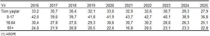 Yaş kümelerine nazaran yoksulluk yahut toplumsal dışlanma riski altında olanların oranı1(%), 2016-2025