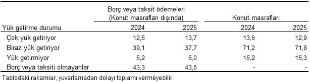 Geçen yıla nazaran konut alımı ve konut masrafları dışında borç yahut taksit ödemesi olanların oranı 0,4 puan azalarak %56,4 oldu. Nüfusun %5,0’ına bu ödemeler yük getirmezken %37,7’sine biraz yük getirdi, %13,7’sine ise çok yük getirdi. Konut masraflarının çok yük getirdiği hanelerin oranı 0,7 puan azalarak %12,9 olurken, bu masrafların biraz yük getirdiği hanelerin oranı 0,6 puan artarak %71,8 oldu. Konut masraflarının yük getirmediğini belirten hanelerin oranı geçen yıla nazaran 0,1 puan artış ile %15,3 olarak hesaplandı.