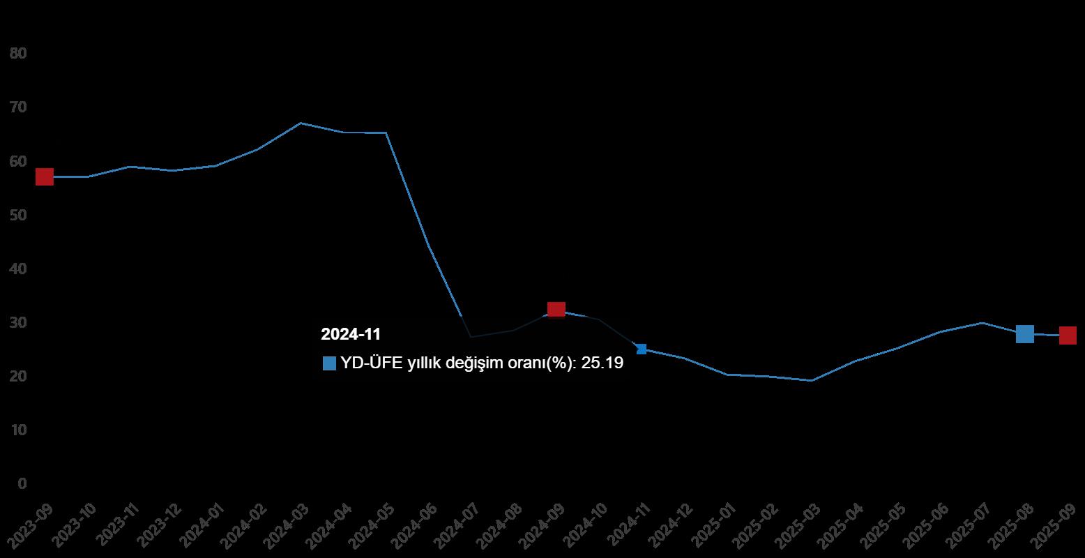 YD-ÜFE 2025 yılı Eylül ayında bir evvelki aya nazaran %2,01 artış, bir evvelki yılın Aralık ayına nazaran %27,55 artış, bir evvelki yılın birebir ayına nazaran %27,71 artış ve on iki aylık ortalamalara nazaran %25,19 artış gösterdi.