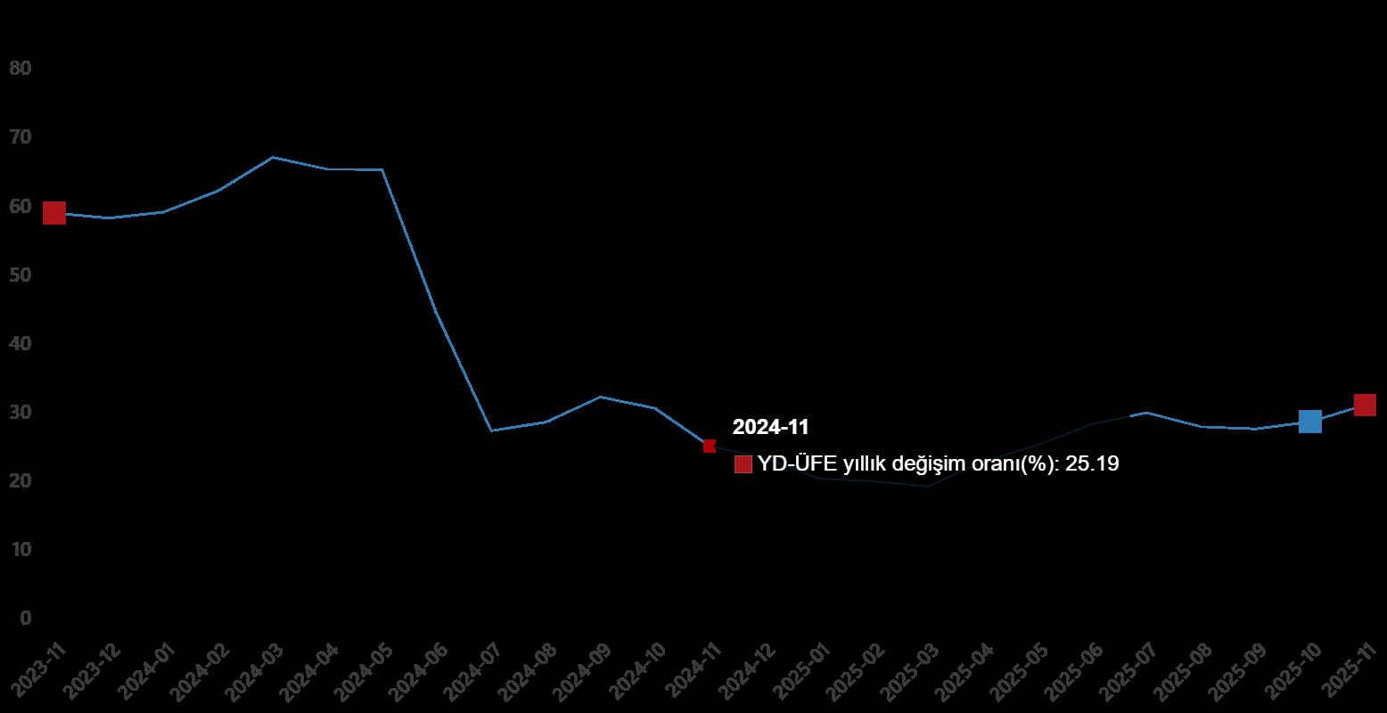 YD-ÜFE 2025 yılı Kasım ayında bir evvelki aya nazaran %1,02 artış, bir evvelki yılın Aralık ayına nazaran %30,01 artış, bir evvelki yılın birebir ayına nazaran %31,19 artış ve on iki aylık ortalamalara nazaran %25,67 artış gösterdi.