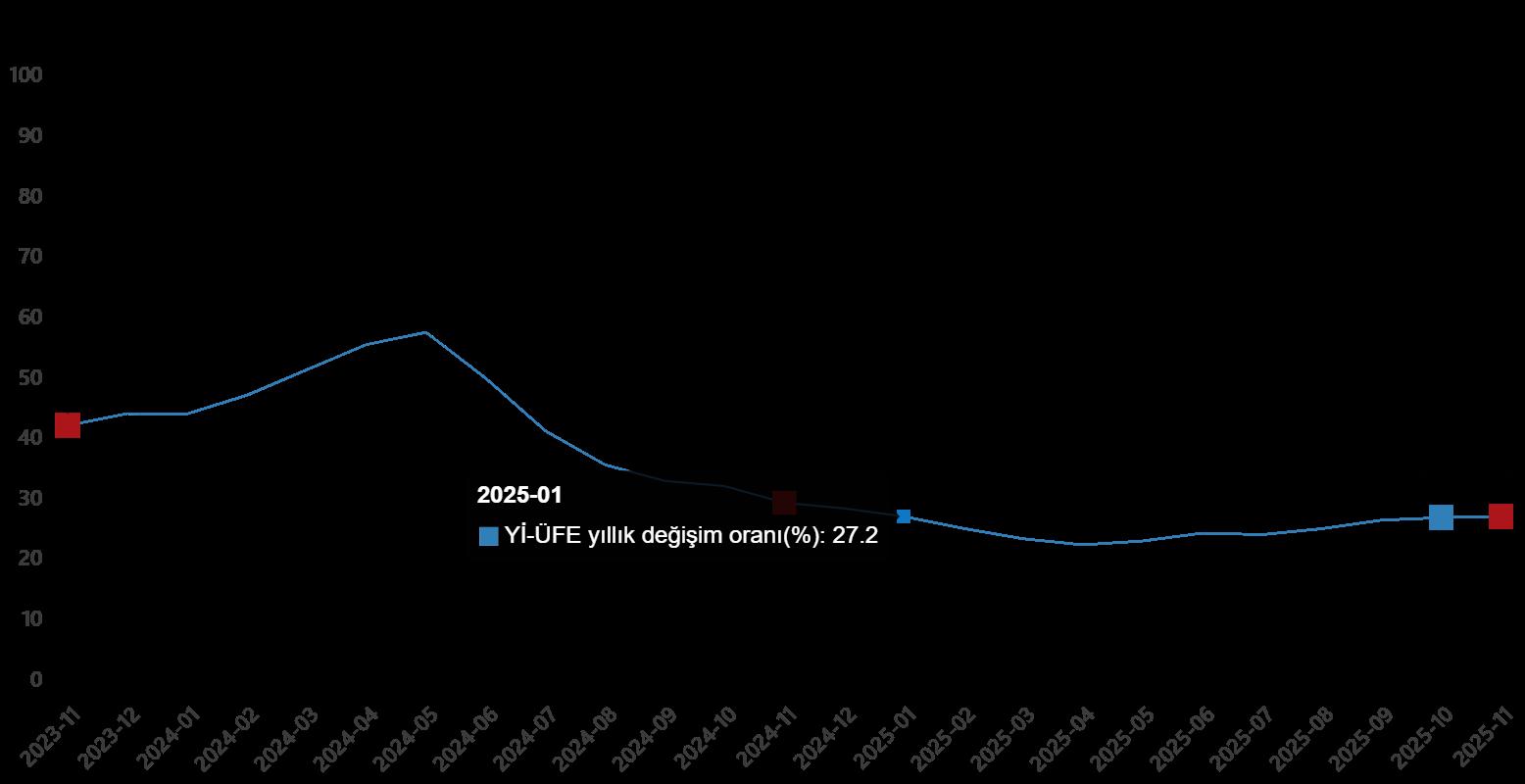 Yİ-ÜFE (2003=100) 2025 yılı Kasım ayında bir evvelki aya nazaran %0,84 artış, bir evvelki yılın Aralık ayına nazaran %26,72 artış, bir evvelki yılın birebir ayına nazaran %27,23 artış ve on iki aylık ortalamalara nazaran %25,37 artış gösterdi.