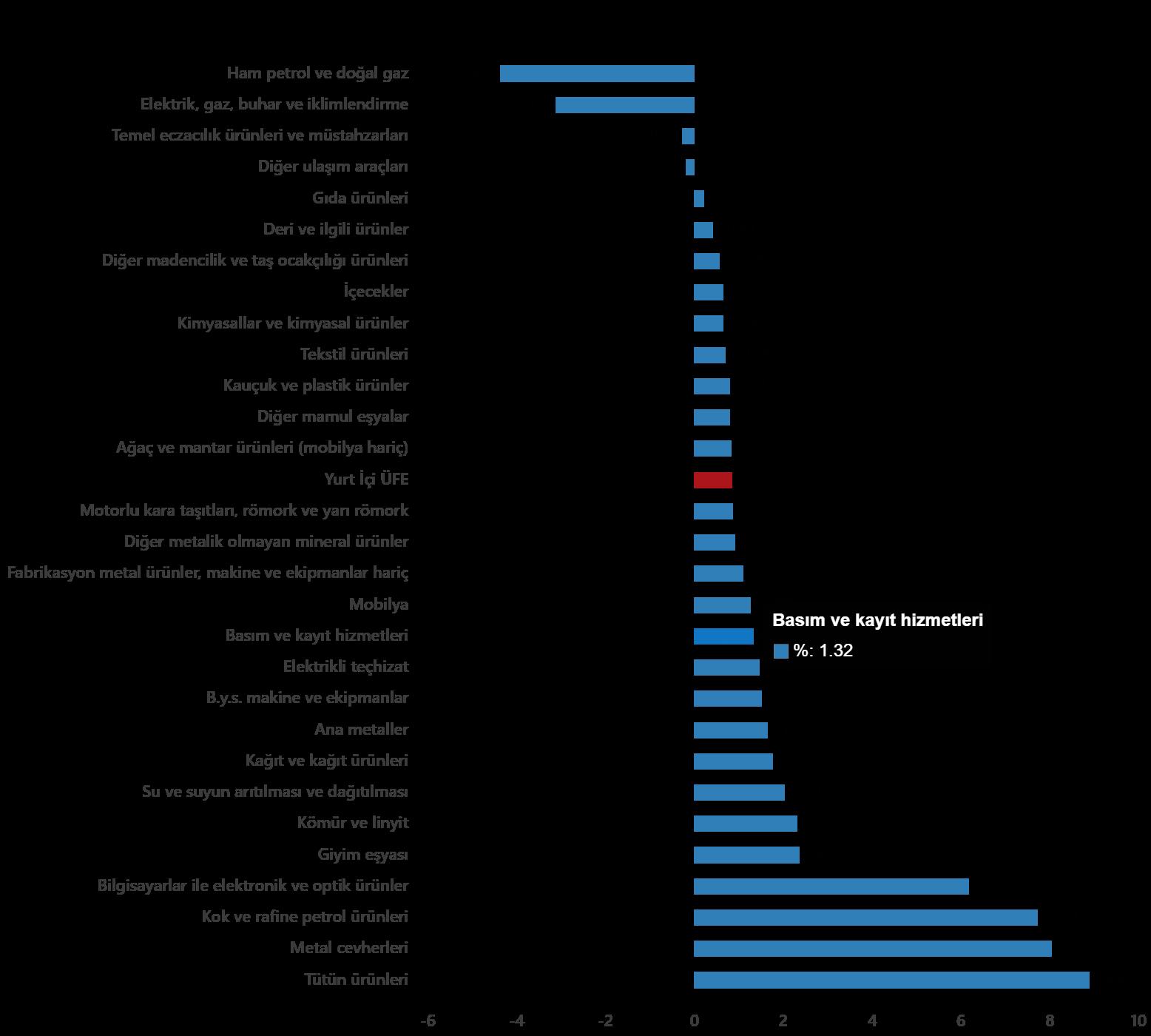 Sanayinin dört bölümünün yıllık değişimleri; madencilik ve taş ocakçılığında %32,60 artış, imalatta %27,04 artış, elektrik, gaz üretimi ve dağıtımında %24,92 artış ve su temininde %57,62 artış olarak gerçekleşti.