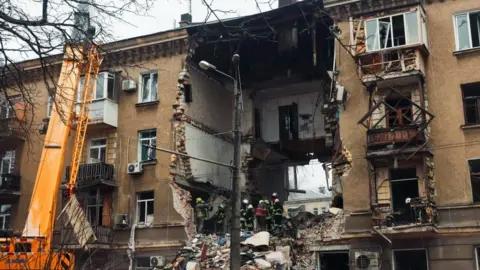 Three bodies were found in the rubble after several floors of one residential building collapsed after the strike, and a number of other buildings were damaged.