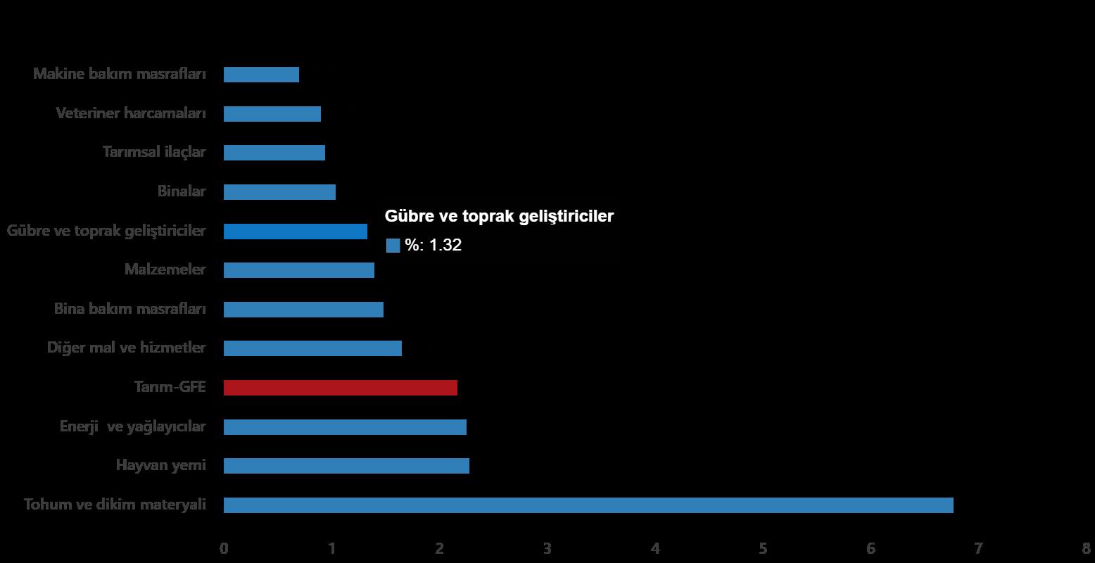 Ana kümelerde bir evvelki aya nazaran, tarımda kullanılan mal ve hizmetler endeksinde %2,29 artış, ziraî yatırıma katkı sağlayan mal ve hizmetler endeksinde %1,35 artış gerçekleşti. Bir evvelki yılın tıpkı ayına nazaran tarımda kullanılan mal ve hizmetler endeksinde %36,01 artış, ziraî yatırıma katkı sağlayan mal ve hizmetler endeksinde %26,60 artış gerçekleşti.